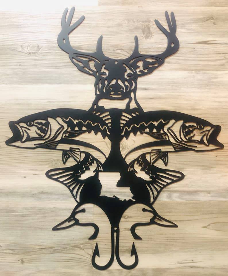 Our metal Fleur de lis Sportsman is the PERFECT piece for the camp or man cave. Get the best of both worlds as you bring home this beautiful and unique creation. Now offering FREE PERSONALIZATION on this piece. Powder coated to last for years to come.